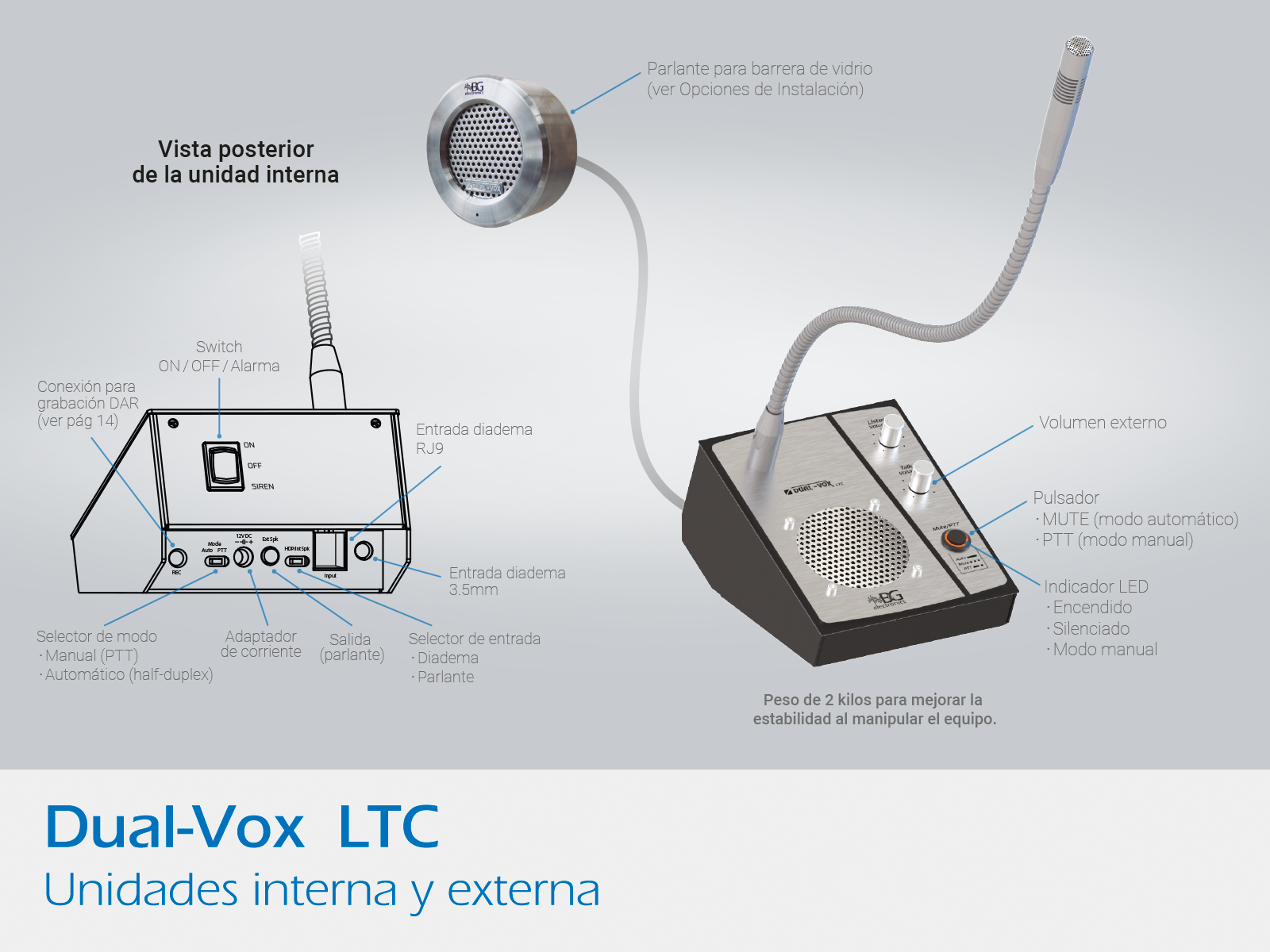 * Control de volumen interno, externo y función mute.