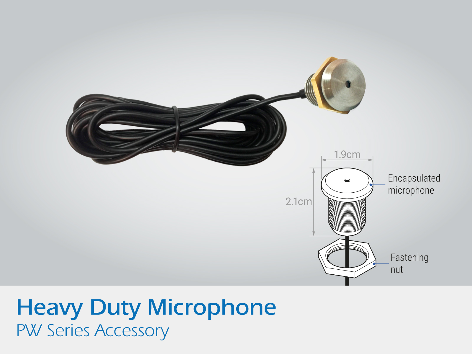Encapsulated external microphone with threaded body and nut to fasten it in place.