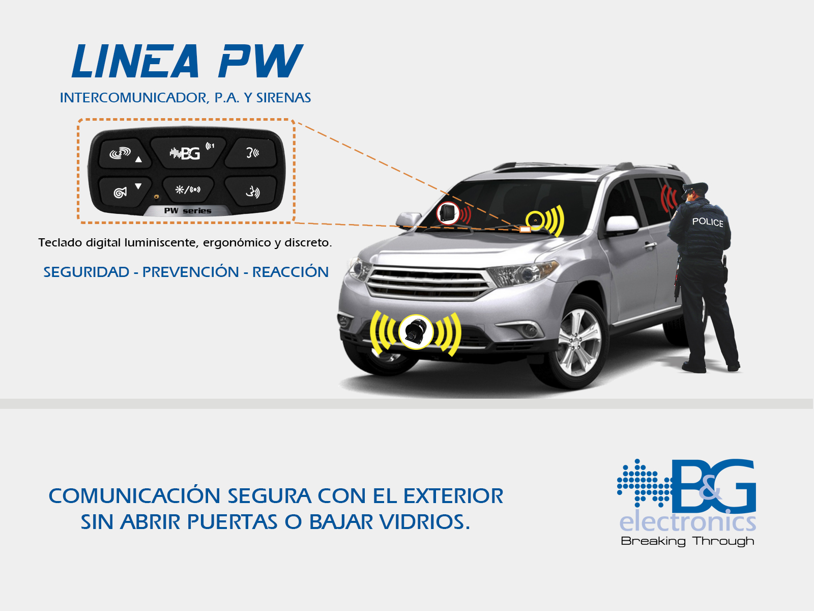 Sistema oculto de intercomunicación, perifoneo y sirenas, especialmente diseñado para vehículos blindados. El complemento perfecto para el máximo aprovechamiento del blindaje buscando la reducción de amenazas creando canales de comunicación con el exterior, sin necesidad de abrir ventanas o puertas y generando vías de escape con los diferentes tipos de sirena.