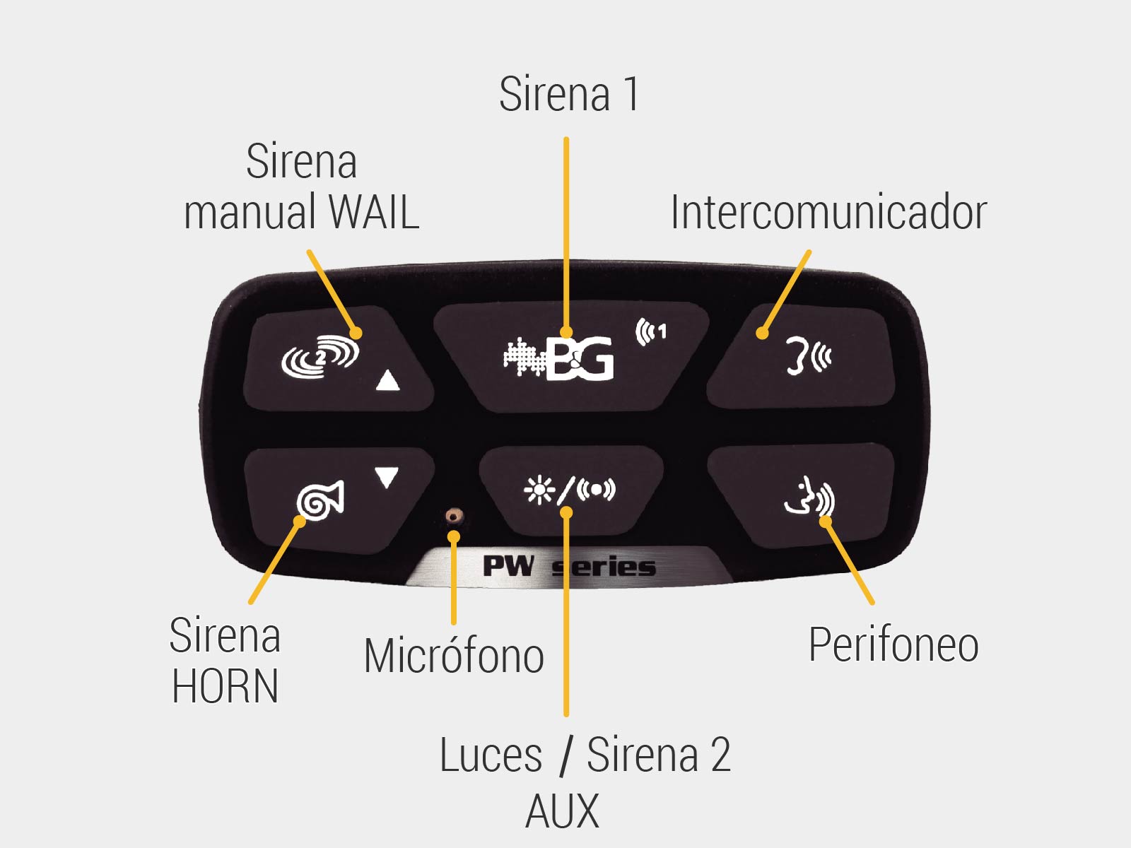 • 4 sirenas continuas seleccionables (PHASER, YELP, WAIL, Hi-Lo)